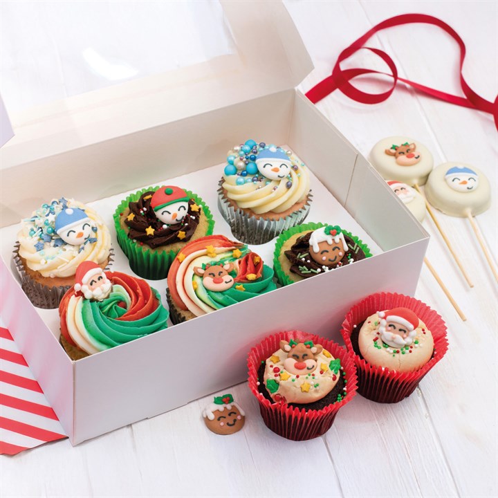 These edible Christmas cutie sugar pipings feature adorable faces of Santa, Snowmen, Reindeer and a Christmas pudding, perfect for creating Christmas treat boxes and cupcakes for gifting. Each edible topper is hand-piped from royal icing and measures approximately 25mm. 10 per pack, 2 of each design.